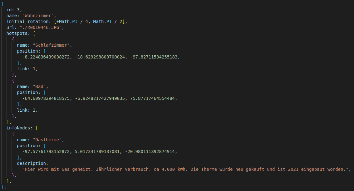360°-Kameras speichern ihre Fotos idR in Rektangularprojektion. Diese Fotos verwendete ich als Textur einer Kugel, in deren Mitte sich die Kamera befindet. So erhalten Benutzer den Eindruck, sich im Raum zu drehen. Um das Kamerastativ zu verdecken, wird automatisch ein Nadir-Patch eingefügt, Hotspots erlauben die Erkundung verschiedener Räume. Die Konfiguration von Bildern und Hotspots erfolgt über eine JSON-Datei: